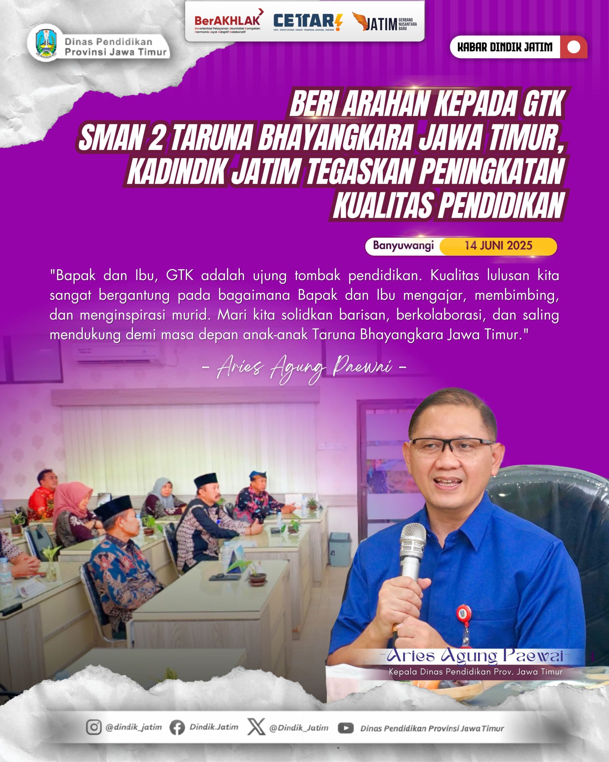 Hal ini disampaikan Kepala Dindik Jatim Aries Agung Paewai saat memberikan arahan langsung kepada seluruh Kepala SMA, SMK, dan SLB Negeri se-Kabupaten Banyuwangi serta Guru dan Tenaga Kependidikan (GTK) di SMAN 2 Taruna Bhayangkara Jatim di Banyuwangi, pada Sabtu (14/6).