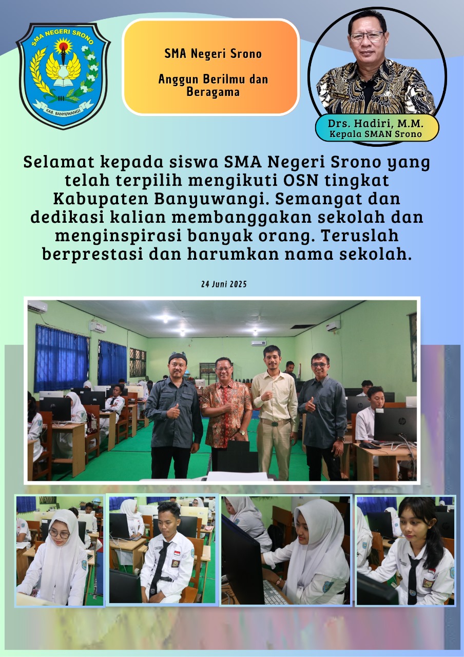 Pelaksanaan Olimpiade Sains Nasional Tingkat Kabupaten (OSN-K) tahun 2025 di SMA Negeri Srono berlangsung dengan lancar dan penuh semangat kompetitif. Kegiatan ini merupakan ajang seleksi bagi siswa-siswi terbaik yang akan mewakili sekolah dalam bidang sains ke jenjang yang lebih tinggi, yakni tingkat provinsi dan nasional.